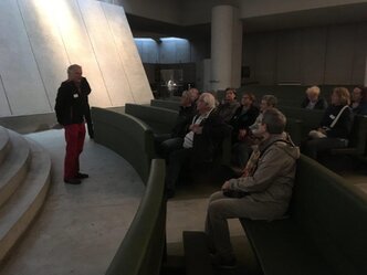 Anschliessend führte Emil Hasler die Gruppe in die katholische Kirche und stellte diese vor. Auf den ersten Blick ist dieser Andachtsraum mit dem Gottesdienstraum der reformierten Kirche identisch und doch irgendwie anders. Beton, Chrom und Glas sind die Materialien die einem sofort ins Auge stechen. Ebenfalls anders ist die Lichtführung, das Licht umgibt die Gemeinde.