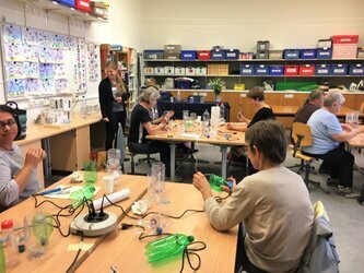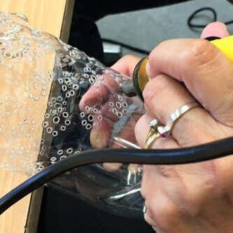 "Das läuft zu Beginn fast ab wie in einer Schulstunde", Tonia versammelt uns mit einem Augenzwinkern alle an einem Tisch. Strukturiert und gut vorbereitet führt sie uns in die verschiedenen Techniken der Bearbeitung der PET-Flaschen ein. Dazu braucht es nur einen Brennstab. Eigentlich geht auch ein Lötkolben.